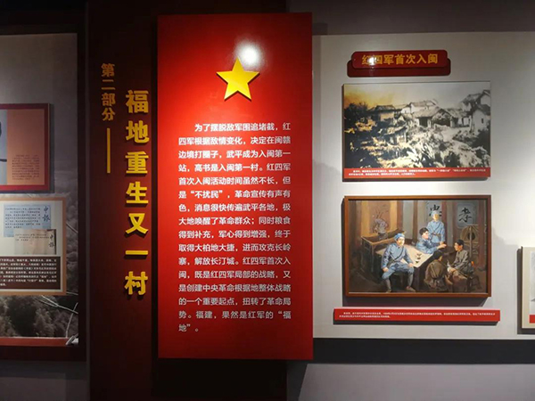 “红四军入闽第一村”陈列馆占地面积约200平方米,展线长度70米,通过图片、文字、声音、视频等多种展陈手段,从“转战千里求破局”“福地重生又一村”“风展红旗美如画”“传承弘扬当自强”等四个篇章展现了红四军二入民主场景和首次入闽对武平和闽西革命斗争产生的巨大影响。