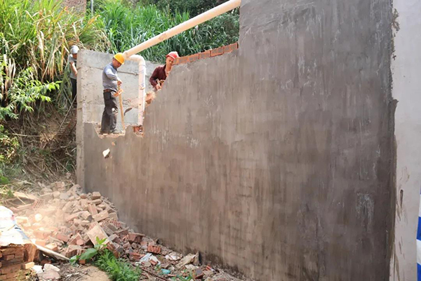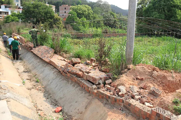 现场3:经查,平川街道石陂坑钟某户未经审批,擅自在原有房屋后砌建围墙,占地面积约56㎡,工作人员及时予以制止,依法发放限期整改通知书,责令其限期自行拆除。但违建户在限期内未拆除整改,本次行动予以强制拆除。