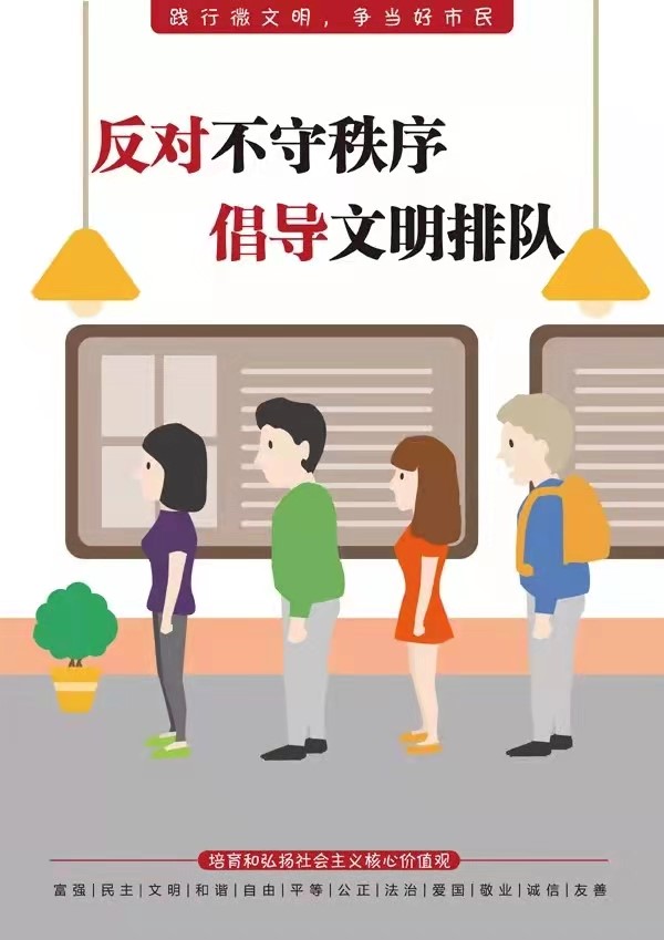 排队象征着秩序,秩序展示社会文明。办事排队,看似一件小事,但是我们要从小事做起,从一点一滴做起,带动身边的人,养成在公共场合自觉排队的好习惯。