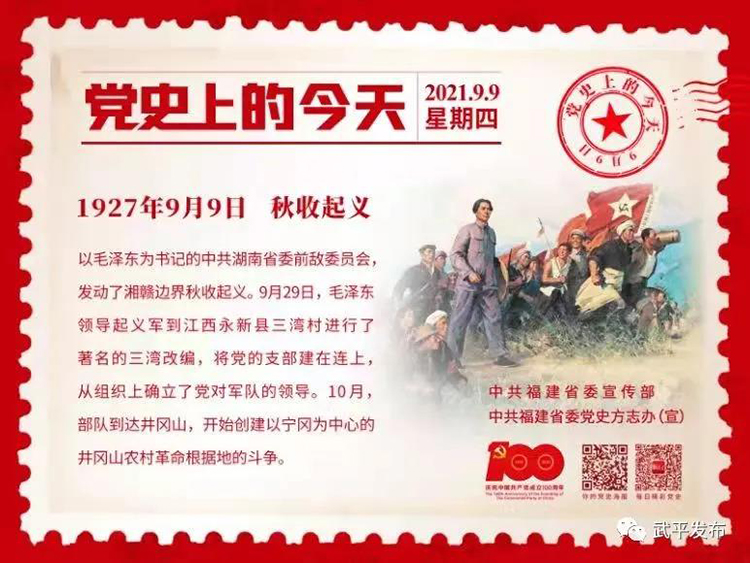 1951年9月9日 毛泽东批转卫生部副部长贺诚关于全国防疫工作的报告,强调必须重视卫生、防疫和医疗工作。批语指出:今后必须把卫生、防疫和一般医疗工作看作一项重大的政治任务,极力发展这项工作。对卫生工作人员必须加以领导和帮助。对卫生工作必须及时加以检查。必须教育干部,使他们懂得,就现状来说,每年全国人民因为缺乏卫生知识和卫生工作引起疾病和死亡所受人力畜力和经济上的损失,可能超过每年全国人民所受水旱风虫各项灾荒所受的损失,因此至少要将卫生工作和救灾防灾工作同等看待,而决不应该轻视卫生工作。这个批语收入《毛泽东文集》第六卷。 2009年9月9日 胡锦涛在主持中共中央政治局第十六次集体学习时,总结新中国成立以来我们党团结带领人民推进社会主义现代化长期实践的四点重要启示:一是要坚持解放思想、实事求是、与时俱进,着力探索和把握我国社会主义现代化规律;二是要坚持以经济建设为中心,着力推进全面协调可持续的科学发展;三是要坚持加强制度建设,着力构建有利于科学发展的体制机制;四是要坚持正确处理改革发展稳定关系,着力保持社会大局稳定。 2014年9月9日 习近平在北京师范大学考察时指出,学为人师,行为世范。做好老师,要有理想信念。广大教师要始终同党和人民站在一起,自觉做中国特色社会主义的坚定信仰者和忠实实践者,忠诚于党和人民的教育事业。要用好课堂讲坛,用好校园阵地,用自己的行动倡导社会主义核心价值观,用自己的学识、阅历、经验点燃学生对真善美的向往。做好老师,要有道德情操。老师对学生的影响,离不开老师的学识和能力,更离不开老师为人处世、于国于民、于公于私所持的价值观。老师是学生道德修养的镜子。好老师应该取法乎上、见贤思齐,不断提高道德修养,提升人格品质,并把正确的道德观传授给学生。 他强调,做好老师,要有扎实学识。扎实的知识功底、过硬的教学能力、勤勉的教学态度、科学的教学方法是老师的基本素质,其中知识是根本基础。好老师还应该是智慧型的老师,具备学习、处世、生活、育人的智慧,能够在各个方面给学生以帮助和指导。做好老师,要有仁爱之心。爱是教育的灵魂,没有爱就没有教育。好老师要用爱培育爱、激发爱、传播爱,通过真情、真心、真诚拉近同学生的距离,滋润学生的心田。好老师应该把自己的温暖和情感倾注到每一个学生身上,用欣赏增强学生的信心,用信任树立学生的自尊,让每一个学生都健康成长,让每一个学生都享受成功的喜悦。他指出,今天的学生就是未来实现中华民族伟大复兴中国梦的主力军,广大教师就是打造这支中华民族“梦之队”的筑梦人。希望全国广大教师把全部精力和满腔真情献给教育事业,在教书育人的工作中不断创造新业绩。 2016年9月9日 习近平在北京市八一学校考察时强调,基础教育是立德树人的事业,要旗帜鲜明加强思想政治教育、品德教育,加强社会主义核心价值观教育,引导学生自尊自信自立自强。基础教育是提高民族素质的奠基工程,要遵循青少年成长特点和规律,扎实做好基础的文章。基础教育要树立强烈的人才观,大力推进素质教育,鼓励学校办出特色,鼓励教师教出风格。 他指出,教育公平是社会公平的重要基础,要不断促进教育发展成果更多更公平惠及全体人民,以教育公平促进社会公平正义。要加强对基础教育的支持力度,办好学前教育,均衡发展九年义务教育,基本普及高中阶段教育。要优化教育资源配置,逐步缩小区域、城乡、校际差距,特别是要加大对革命老区、民族地区、边远地区、贫困地区基础教育的投入力度,保障贫困地区办学经费,健全家庭困难学生资助体系。要推进教育精准脱贫,重点帮助贫困人口子女接受教育,阻断贫困代际传递,让每一个孩子都对自己有信心、对未来有希望。 他强调,中小学生是青少年的主体,是国家的未来和希望。中小学生要立志成才,必须勤奋学习、提高综合素质,努力做到修身立德、志存高远,勤学上进、追求卓越,强健体魄、健康身心,锤炼意志、砥砺坚韧。同学们都要自觉加强道德养成,从小就让社会主义核心价值观的种子在心中生根发芽,把国家、人民、民族装在心中,注重养成健康、乐观、向上的品格;都要乐于学习、勤于学习、善于学习,在求知境界上越来越高;都要把身心健康牢牢抓在手上,养成良好的生活习惯,经常参加劳动和体育锻炼,通过多种方式怡情养性;都要敢于面对各种困难和挫折,自觉培养不畏艰难、顽强奋进的意志品质。他希望同学们敞开胸怀拥抱自然,点点滴滴播撒阳光,经年累月铸就美好,努力做一个心灵纯洁、人格健全、品德高尚的人,努力做一个有文化修养、有人文关怀、有责任担当的人。 1927年 9月9日 以毛泽东为书记的中共湖南省委前敌委员会,领导工农革命军第一师发动湘赣边界秋收起义。29日,起义军到达江西永新三湾村时进行改编,将党的支部建在连上,从组织上确立了党对军队的领导,这是建设无产阶级领导的新型人民军队的重要开端。10月,起义军到达井冈山,开始创建农村革命根据地的斗争。 1951年 9月9日 中共中央召开第一次农业互助合作会议,通过《中共中央关于农业生产互助合作的决议(草案)》,并于12月发给各级党委试行。 1976年 9月9日 毛泽东逝世。18日,首都百万群众在天安门广