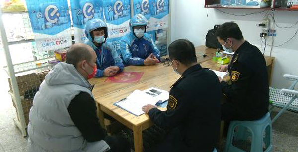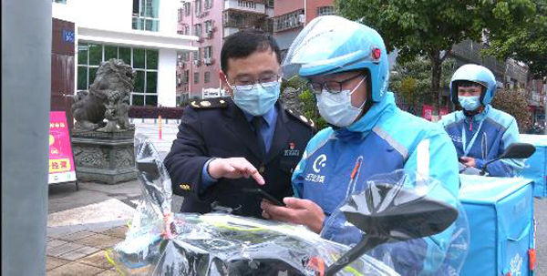 3月23日,市场监督管理局检查组在南门桥、树子坝等地随机拦停外卖配送骑手,检查他们的健康码、行程码以及核酸检测结果等,严格督促他们要做好个人防护安全送餐。