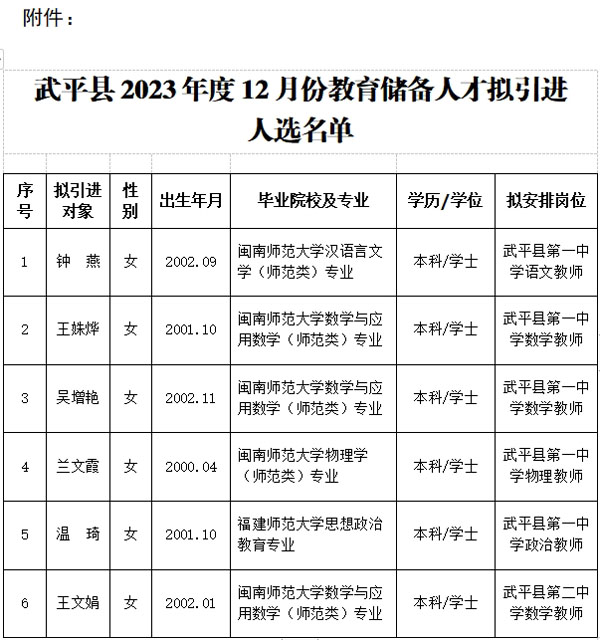 根据《福建省武平县2023年度教育卫生“双十”储备人才引进公告》等文件精神,按照自主报名、资格审查、面试、面谈考核、会议研究等环节,并经县委人才工作领导小组同意,现将武平县2023年度12月份教育储备人才拟引进人选予以公示。公示时间从2024年5月14日起开始,公示期为5个工作日。在此期间,欢迎群众以来电、来信、来访等形式向县委人才办反映情况。