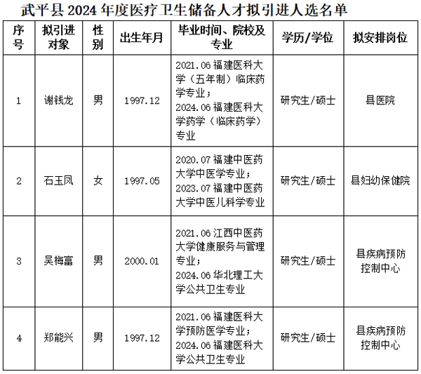 根据《福建省武平县2024年度教育卫生“双十”储备人才引进公告》等文件精神,按照自主报名、资格审查、面试、面谈考核、政审、体检、会议研究等环节,现将武平县2024年度医疗卫生储备人才拟引进人选(见附件)予以公示。公示时间从2024年6月27日起开始,公示期为5个工作日。在此期间,欢迎群众以来电、来信、来访的形式向县委人才办反映情况,发表看法和意见。 公示电话:0597-4892596 来访来电时间:公示期间每天上午8:00-12:00,下午3:00-6:00 接待科室:中共武平县委组织部(人才办) 来信投寄:中共武平县委组织部(人才办) (邮政编码364300)