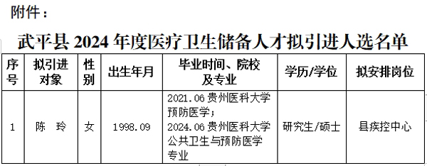 根据《武平县2024年度教育卫生“双十”储备人才引进公告》等文件精神,按照自主报名、资格审查、面试、面谈考核、政审、体检、会议研究等环节,现将武平县2024年度医疗卫生储备人才拟引进人选(见附件)予以公示。公示时间从2024年8月2日起开始,公示期为5个工作日。在此期间,欢迎群众以来电、来信、来访的形式向县委人才办反映情况,发表看法和意见。 公示电话:0597-4892596 来访来电时间:公示期间每天上午8:00-12:00,下午3:00-6:00 接待科室:中共武平县委组织部(人才办) 来信投寄:中共武平县委组织部(人才办) (邮政编码364300)
