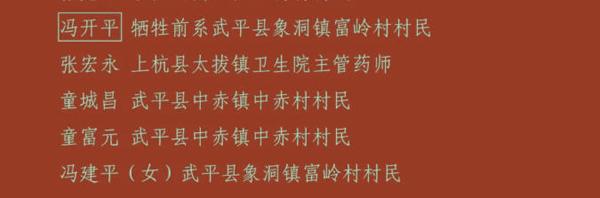 近日,福建省见义勇为人员奖励和保护工作委员会作出关于奖励福建省第三十一次见义勇为先进个人的决定,全省共有52人获得表彰。武平县象洞镇富岭村村民冯开平、冯建平(女),武平县中赤镇中赤村村民童城昌、童富元上榜其中。