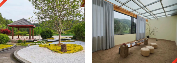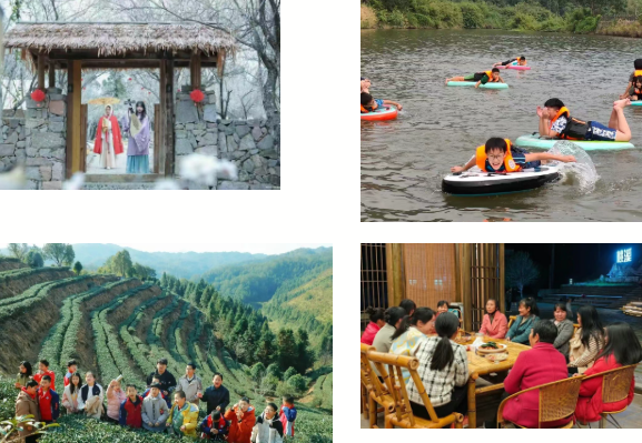 桃澜茶院里,白墙黛瓦映青山,锦鲤游弋伴茶香,游客可晨巡茶山、午煮香茗、暮赏茶田。茶山小院由老茶厂翻新而成,中式家具与非遗装饰相映成趣,制茶体验、客家美食、露台冥想、非遗研学等业态一应俱全。茶寮庭落藏于竹林梅园间,竹筏漂流、林间茶席、徒步探秘,让每一位访客都能沉浸式感受自然馈赠。