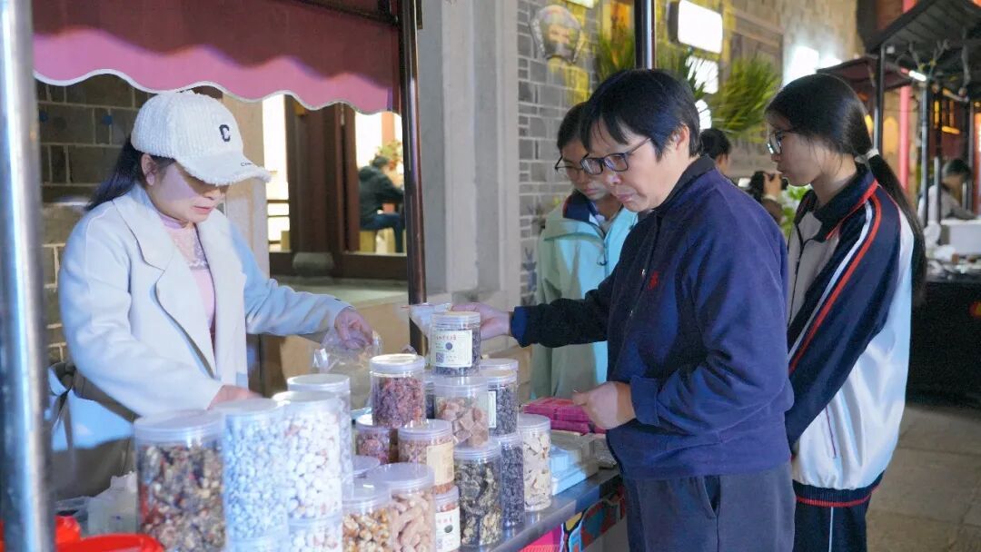 展演以欢快灵动的船灯表演拉开帷幕,身着特色服饰的表演者操控着色彩艳丽的船灯,灵动的姿态引得观众纷纷驻足观看。紧随其后的龙灯表演迅速将现场气氛推向高潮,金黄龙身随龙珠穿梭游走,栩栩如生的姿态承载着吉祥的美好寓意。作为本次非遗展演的重头戏,石家拳表演刚劲凌厉,一招一式尽显中华武术的深厚底蕴;功夫火壶表演技艺精湛,赢得满场喝彩。悠扬婉转的古筝演奏则为热闹的现场增添了几分雅致,悠扬旋律与古街的古朴景致相得益彰。与此同时,现场的美食与非遗产品展区同样人气爆棚,麦芽糖、十八子糕、糖画等特色美食吸引市民游客纷纷驻足体验。