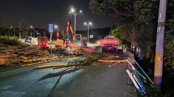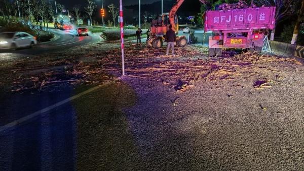 1月10日16时30分左右,国道357线武平城厢镇文溪村路段突发一起运输车辆货物撒漏事故,整车木材因绑扎不牢散落在行车道上,占据了整幅路面,导致交通中断。