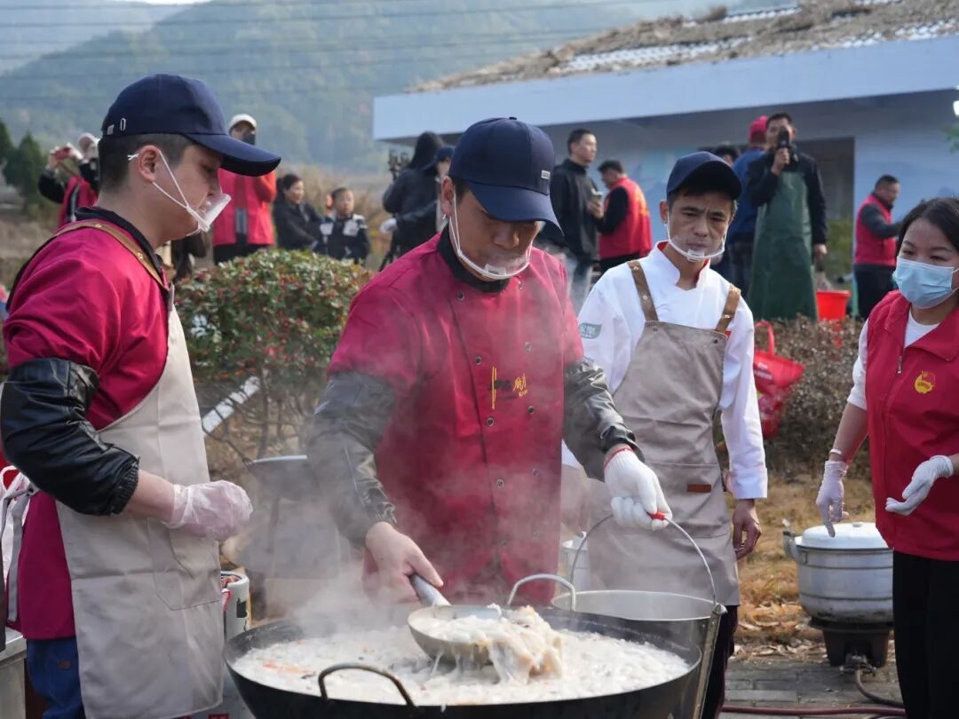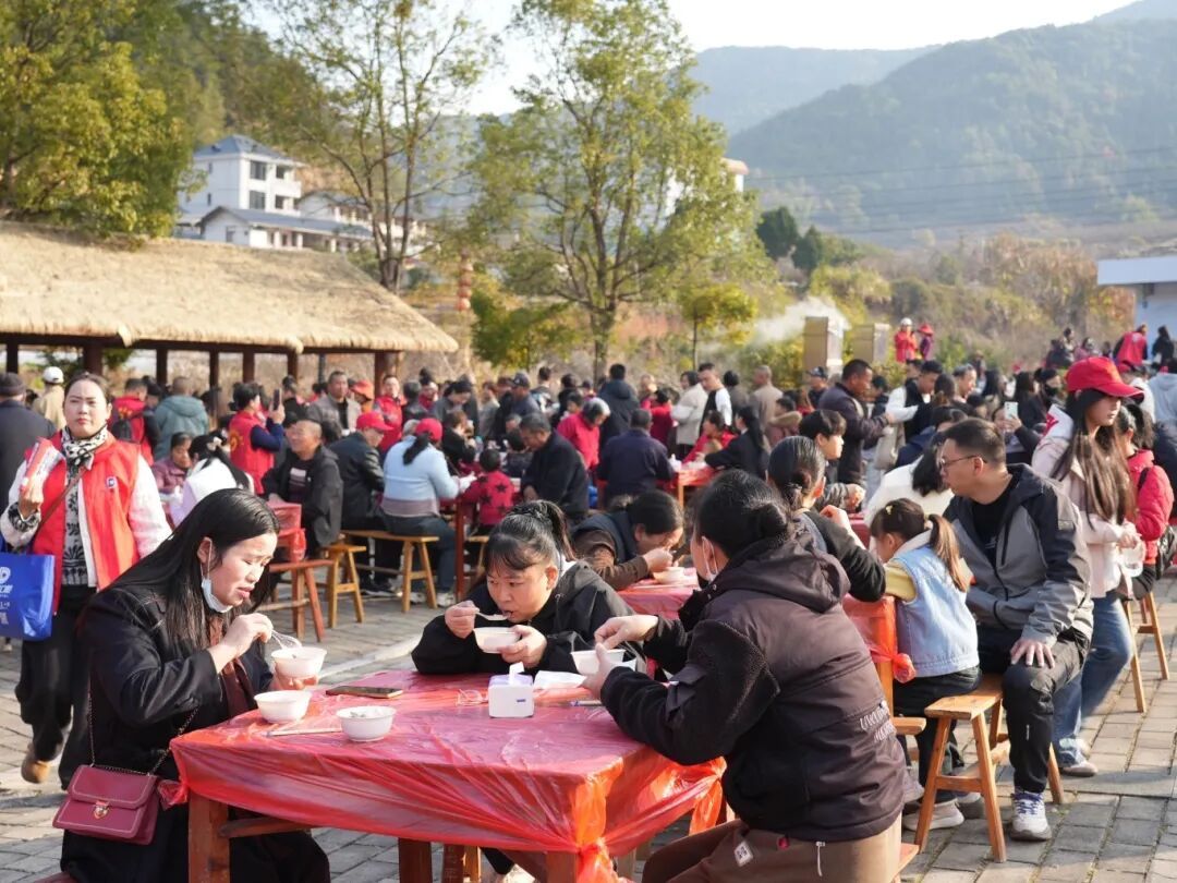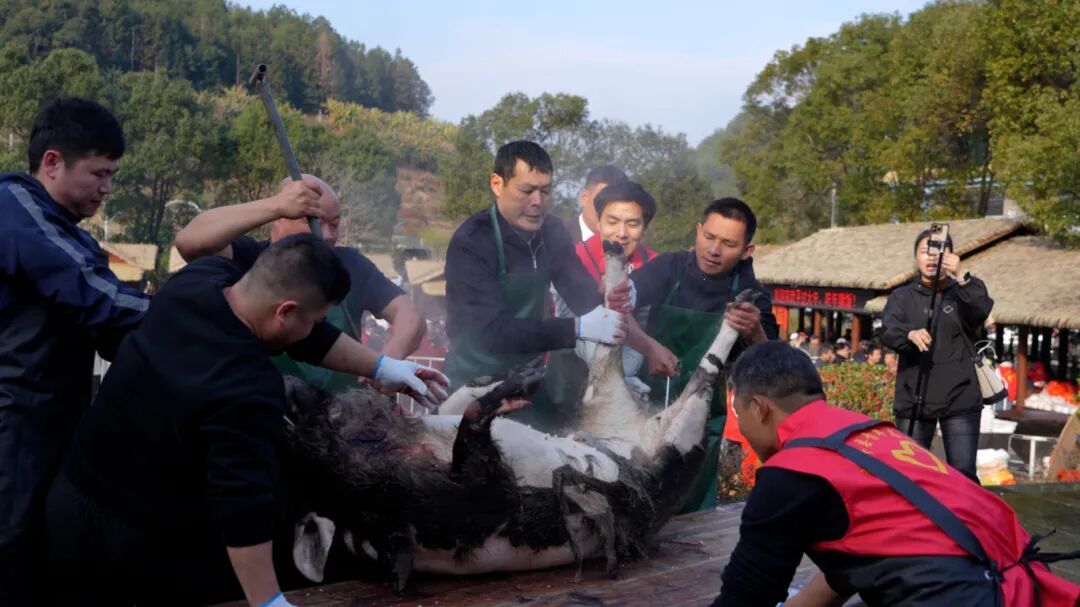 为迎接八方游客,活动方早早备下六只跑山黑猪。活动现场,村民们围着柴火灶忙碌不停,烧水、褪毛、切肉、备菜一气呵成。新鲜的土猪食材在锅中翻滚沸腾,浓郁香气四处弥漫,引得不少游客驻足围观。一张张圆桌整齐摆放,来自各地的游客围坐一堂,一同品尝这份地道的乡土美味。