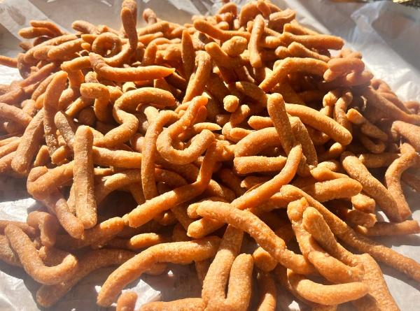 随后,切好的细条状面团被缓缓放入滚烫的油锅中。在热油的作用下,面团迅速膨胀、翻滚,逐渐染上诱人的金黄色泽,待浮上油面后,转至小火慢炸半小时,待表皮变得酥脆干爽,一道正宗的黄糖丝角子便新鲜出炉。这道小吃耐存性极强,放置三到六月依然风味不减。