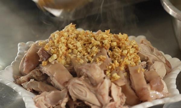 “这道菜最重要的是要现宰、现剖、现淋,把兔肉的鲜嫩牢牢锁住,才能保留原汁原味。”谢万生介绍,制作荷包兔全程紧扣“鲜”字,每一步都隐藏着老手艺的讲究。 将洗净沥干的整兔下锅焯煮,大火煮沸后转小火慢炖约15分钟,待筷子能轻松戳入且无血水渗出时捞出切块。 紧接着,锅中倒入花生油与猪油的混合油,油温升起后下入大蒜爆炒,待香气升腾时灼浇在兔肉上。随后注入原炖兔汤,加盐、味精调味煮沸,舀起滚烫汤汁反复淋浇兔肉,让每块肉都吸足鲜醇滋味。