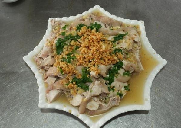 最后一道点睛之笔,切细的荷包叶(当地称薄荷)入锅稍煮,用带着清凉气息的汤料完成最后淋浇。顿时,整道菜鲜香四溢,引人垂涎。
