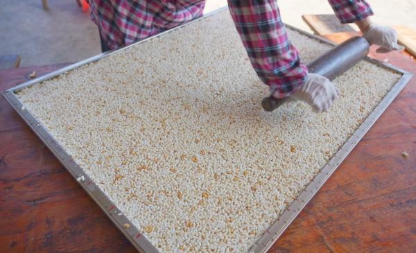 腊月年关近,寻味至乡间。1月26日,走进武平县东留镇桂坑村的炒米糖制作点,香甜的气息裹着烟火气扑面而来,老手艺人何红连正忙着制作这道承载着乡愁的传统年味美食——炒米糖。 何红连如数家珍地介绍,“我们一直坚持做原汁原味的传统口味,就是想把小时候过年的味道留下来。这门手艺全靠纯手工,从选料到制作都按老方法来。” 何红连说,米的品质更是决定口感的关键。精选优质糯米,经开水浸泡、抹油蒸熟,碾散晾晒五六天,最后入锅油炸,便能蜕变成金黄酥脆的炒米。花生需提前油炸,擀碎后筛去花生皮,芝麻则要提前炒香备用。 而熬制糖浆则是炒米糖香甜风味的核心。按比例放入麦芽糖、白砂糖和清水,开小火慢熬,并不停搅动以防糊锅。待糖浆熬至起大泡、能拉丝起球的状态,迅速倒入炒米、芝麻和花生,并快速翻炒,让每一粒炒米都均匀裹满糖浆。随即盛入特制木框,用擀面杖压实擀平,冷却定型后切块,金黄酥脆的手工炒米糖就新鲜出炉了。 “每到过年,很多外出打工还有外地的人,一回来就会专门来买。有些人还会提前预定,生怕来晚了买不到。他们说一吃到炒米糖就觉得回到家了,有了过年的味道。”顾客的认可,让何红连觉得所有的坚守都分外值得。 一块小小的炒米糖,承载的不仅是舌尖的甜脆,更是绵长的乡情与团圆的慰藉。