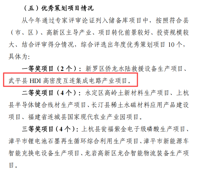近日,喜讯传来,在2025年市级优秀策划项目评比中,武平县推荐的“武平县HDI高密度互连集成电路产业项目”脱颖而出,荣获一等奖。 这是继2021年以来,武平县第五次斩获该奖项,实现2021至2025年连续五年蝉联市级优秀策划项目评比一等奖,成功实现“五连冠”,创下近年来的最好成绩,充分彰显了武平县在项目策划领域的卓越实力。