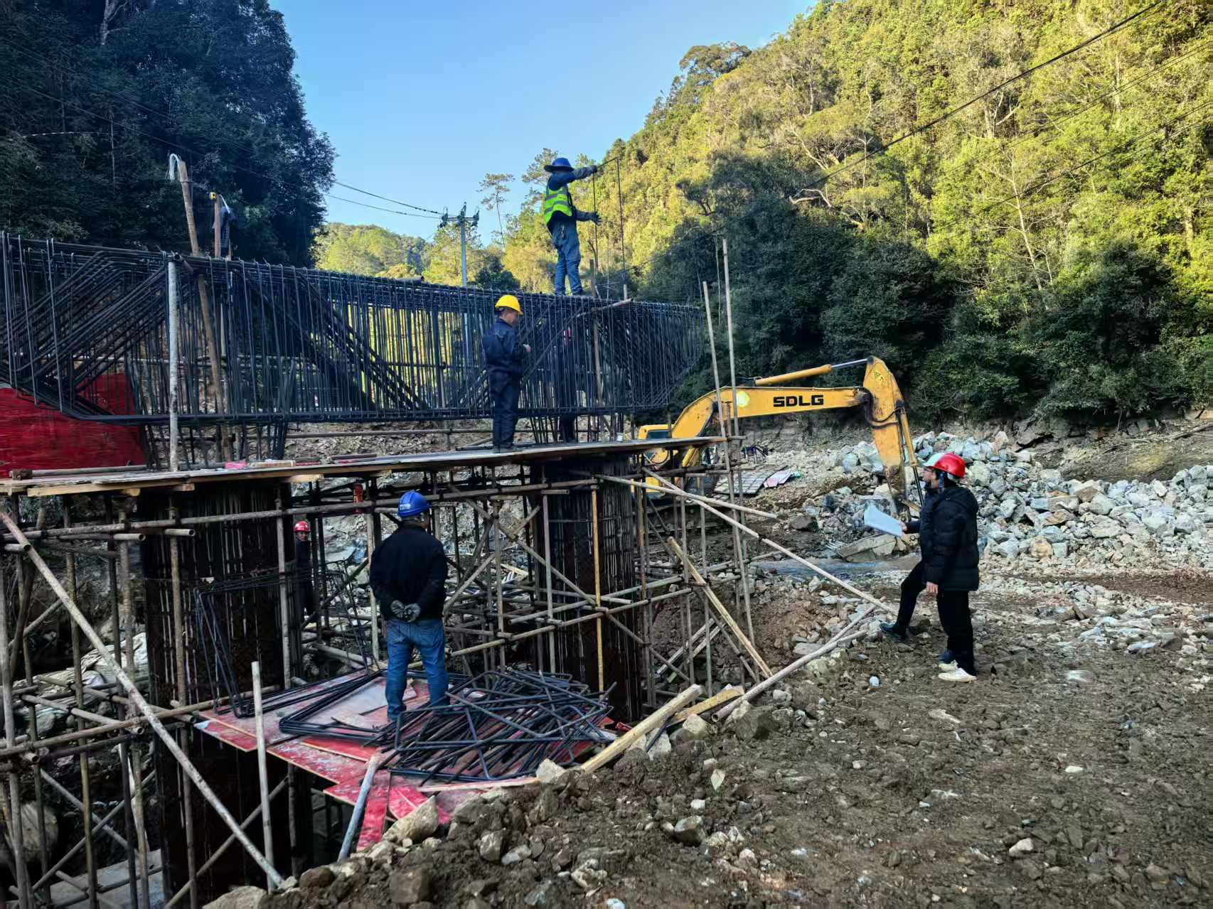 2月10日,在武平县永平镇恬下村恬下一桥危桥改造工程建设现场,工人们正紧张有序地绑扎钢筋,挖掘机同时进行临时便道开挖,全力保障春节期间村民出行安全。