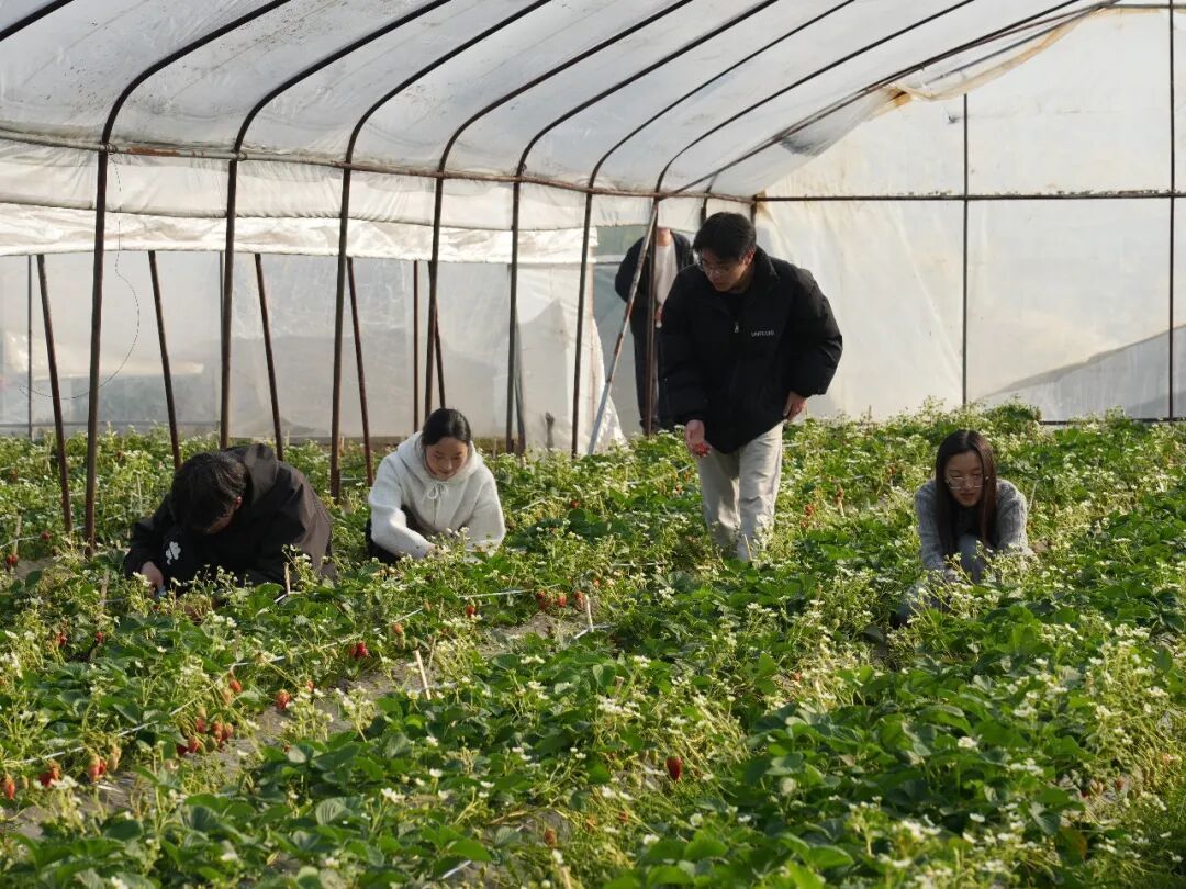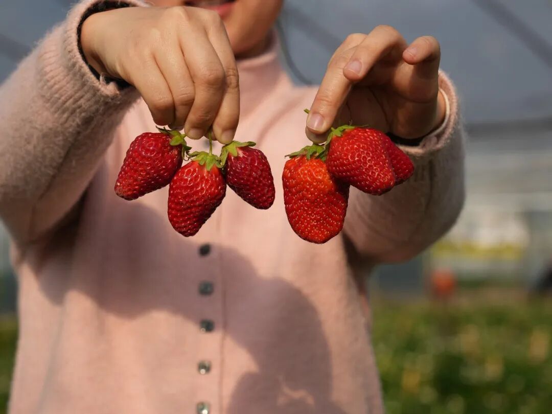 在采摘园大棚内,翠绿的藤蔓间颗颗饱满圆润、色泽鲜亮的草莓缀满枝头,果香扑鼻。游客们提着果篮穿梭其间,体验亲手采摘的乐趣。
