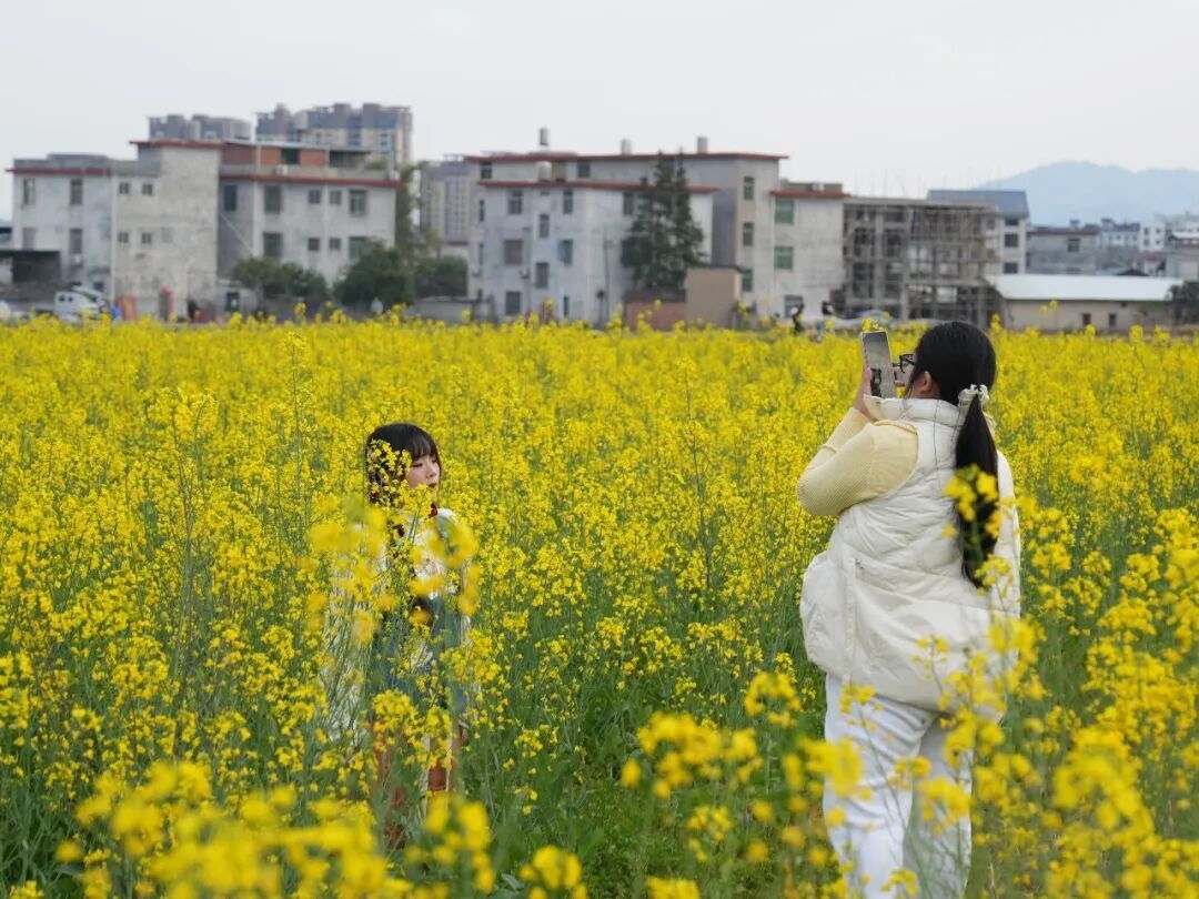 大棚外,金色油菜花海随风摇曳,与田园村落相映成趣,成为网红打卡点。游客漫步花间,拍照留念,尽情享受春日美景。