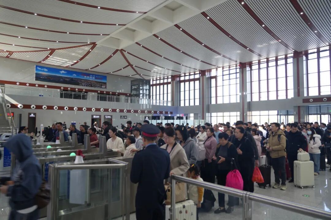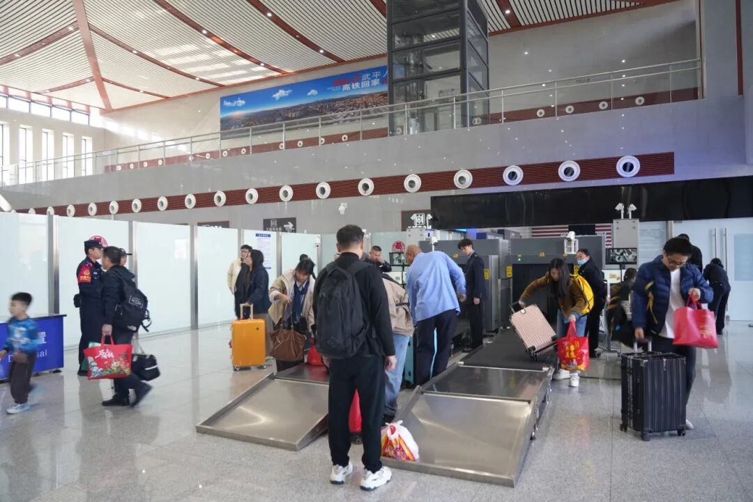 当天上午,武平站内外人来人往。进站口安检区,旅客们依次将行李放上传送带,工作人员专注地进行安检操作;候车大厅座无虚席,随处可见旅客们忙碌的身影,有人低头整理着返程的行囊,有人对着手机和家人进行视频通话道别。