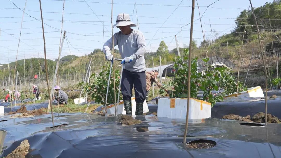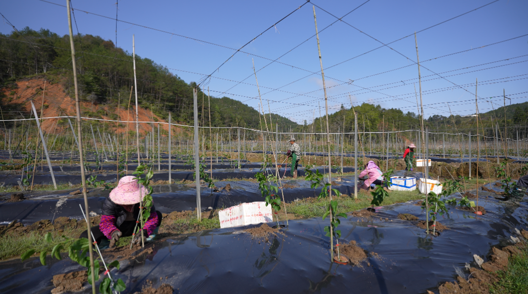 3月6日,记者走进象洞镇种植户钟永桂的百香果种植基地,只见工人们分工协作、配合默契——运苗、打孔、定植、绑枝、浇水等工序有条不紊。一排排翠绿的百香果苗攀附着竹条,在春风中焕发勃勃生机。