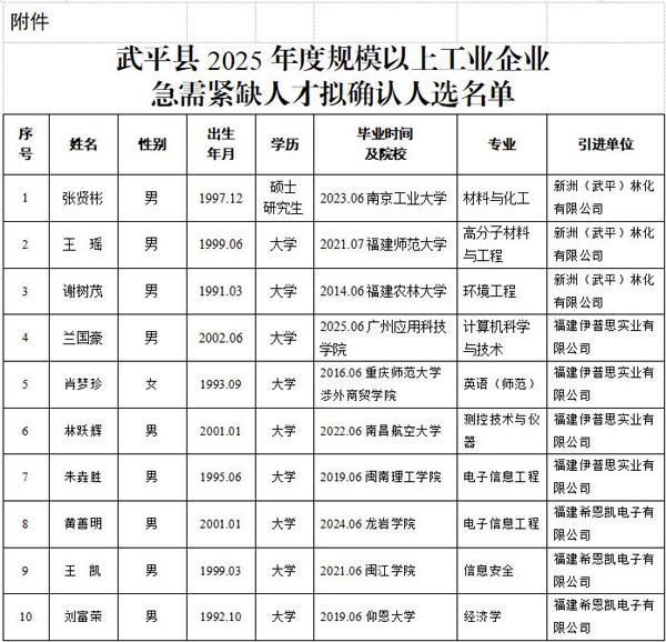 根据《福建省武平县2025年度规模以上工业企业急需紧缺人才引进公告》等文件精神,经企业自主引进、个人申报、相关部门联合会审并经县委人才工作领导小组会议研究等程序,现将武平县2025年度规模以上工业企业急需紧缺人才拟确认人选予以公示。公示时间从2026年3月27日起开始,公示期为5个工作日。在此期间,欢迎群众以来电、来信、来访的形式向县委人才办反映情况,发表看法和意见。 公示电话:0597-4892596 来访来电时间:公示期间每天上午8:00-12:00,下午2:30-5:30 接待科室:中共武平县委组织部(人才办) 来信投寄:中共武平县委组织部(人才办) (邮政编码364300) 中共武平县委人才办 2026年3月26日