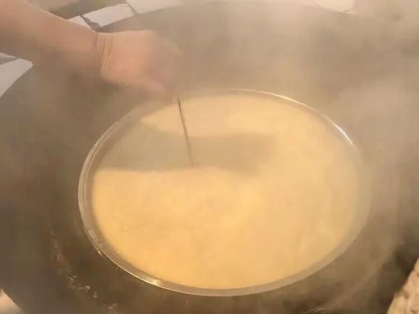 熬浆与蒸制:米浆倒入锅中,用文火慢煮,不断搅拌防止烧糊。待水分蒸发、米浆凝结成米团后,盛入铁盘,放进土灶大锅中蒸制。柴火烈烈烧着,大约四十分钟的等待,便是灰水粄从浆液到软糯糕体的蜕变。