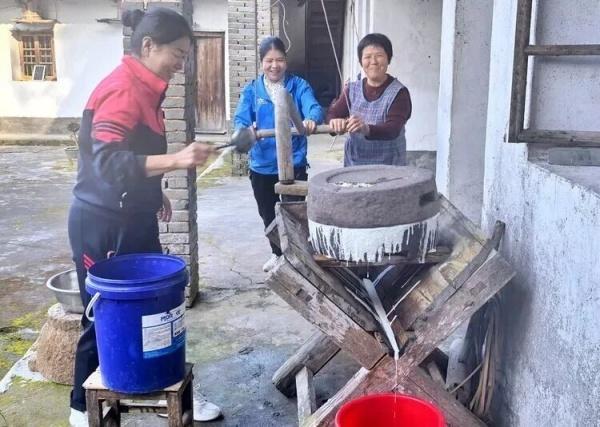 浸泡与磨浆:将洗净的大米倒入备好的灰水中浸泡,泡好的米粒呈淡黄色,随后将其磨成细腻的米浆。传统的石磨慢碾,是武平灰水粄口感软糯又弹牙的关键,也是客家老手艺里藏不住的细致用心。
