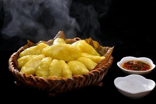 捶打与成型:蒸熟的灰水粄被端进石臼,木槌一下一下重重捶打,粄团在捣揉中变得愈发筋道。刚做好的灰水粄,色泽金黄透亮,散发着淡淡的草木清香。
