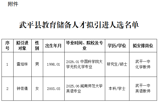 根据《武平县2025年度教育卫生“双十”储备人才引进公告》等文件精神,按照自主报名、资格审查、面试、面谈考核、政审、体检、会议研究等环节,现将我县教育储备人才拟引进人选(见附件)予以公示。公示时间从2026年4月13日起开始,公示期为5个工作日。在此期间,欢迎群众以来电、来信、来访的形式向县委人才办反映情况,发表看法和意见。 公示电话:0597-4892596 来访来电时间:公示期间每天上午8:00-12:00,下午2:30-5:30 接待科室:中共武平县委组织部(人才办) 来信投寄:中共武平县委组织部(人才办)(邮政编码364300)