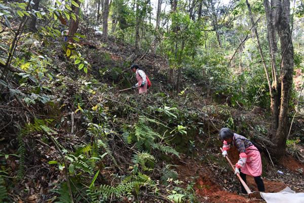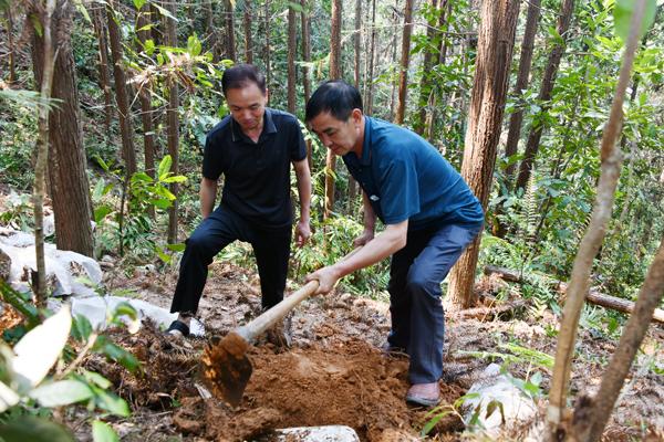 在上湖村水口山灵芝种植基地,种植大户刘华芳正带领农户有条不紊地作业,挖坑、放菌棒、回填土壤,林间洋溢着蓬勃生机。