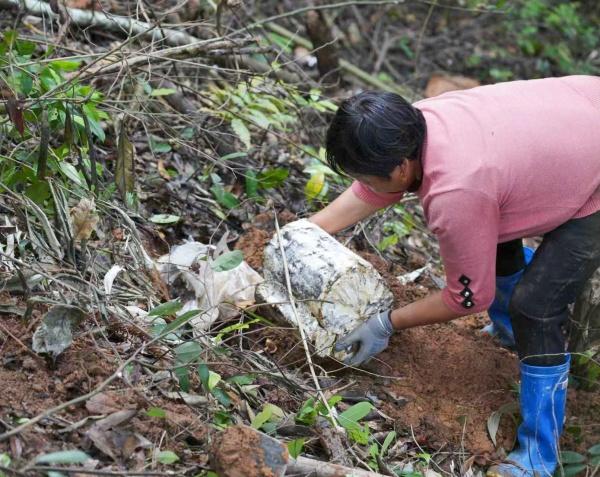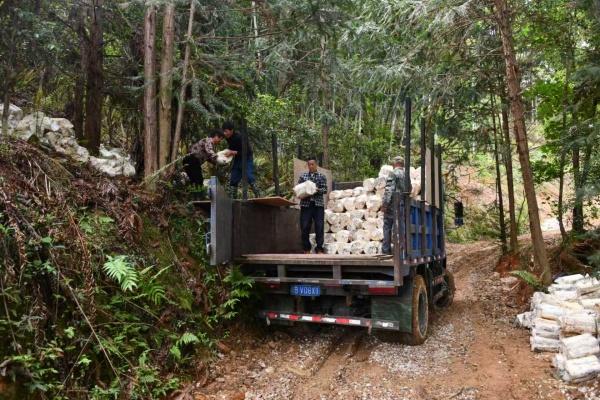 4月24日,走进武平县象洞镇银梓岙共富林场灵芝种植基地,满山绿意间,帮工们正有序进行菌棒搬运、挖坑、覆土等作业,一派繁忙景象。